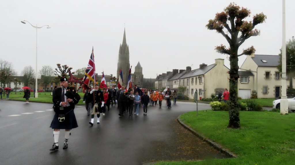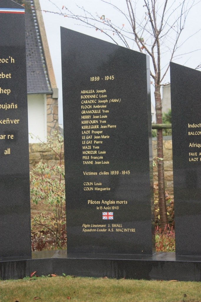 Sandy MacIntyre crashed in his plane in nearby St Frégant. Johnnie Small jumped out of his plane, but his parachute did not open His plane crashed at the edge of town. Brian Biddulph was seen to jump from his plane over the sea and was presumed drowned. In 2023 Brian’s name was added to the memorial and unveiled by a member of his family.