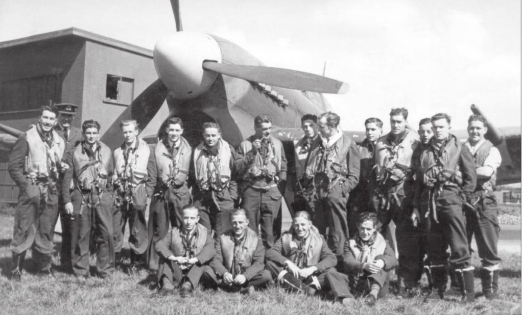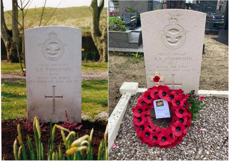 The youngest brother Richard Keith Thompson born in January 1923 served as fighter pilot with 266 RAF “Rhodesia” Squadron based at Exeter On 3 August 1943 his squadron of Hawker Typhoons led by Sqn Ldr Sandy MacIntyre (see Blog post) were deployed as close air protection to 8 Stirling bombers on a daylight raid on the submarine pens at Brest. Six Luftwaffe FW109 rose to intercept and in the ensuing dogfight Richard and Sandy’s planes were badly damaged. Richard’s plane spun out of control. The plane crashed near the town of Gouesnou without him being able to bale out. He is buried in Gouesnou Churchyard.